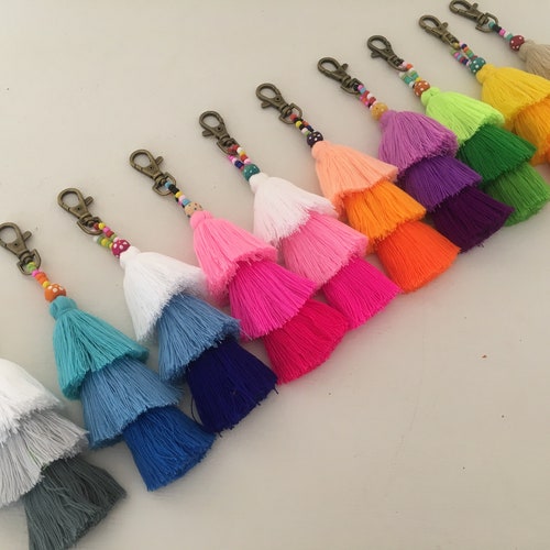 Layered Tassel Boho Keyring Keychain Pompom Purse Charm Etsy